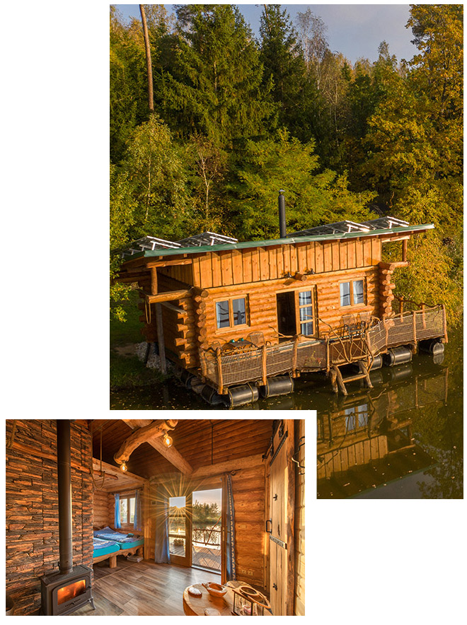 Z plovoucí chatky na vodě si zase vychutnáte úžasný výhled na rybník a okolní krajinu.