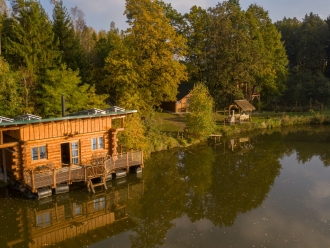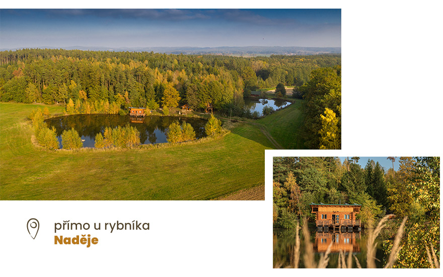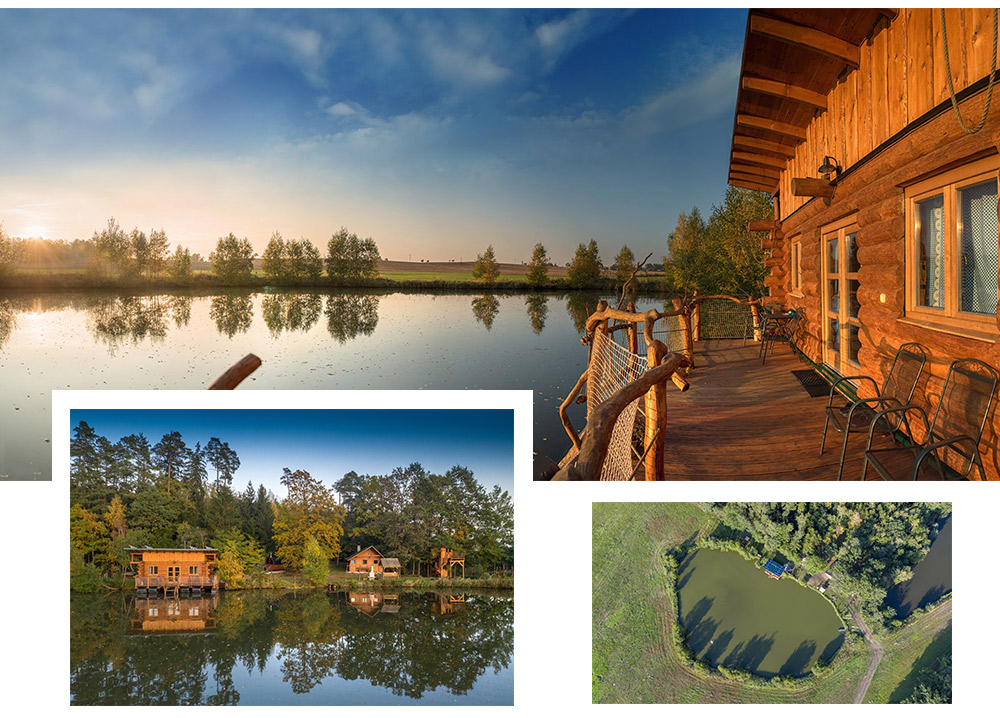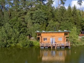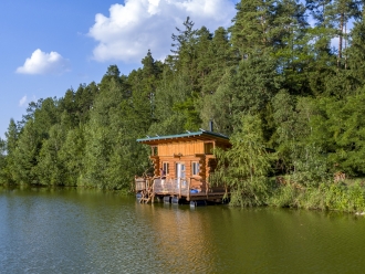 Plovoucí rybářský srub na vodě nabízí jedinečný zážitek uprostřed přírody – ráno vás probudí šplouchání kapříků a jemné kolébání vody pod vámi.
