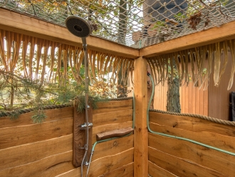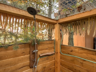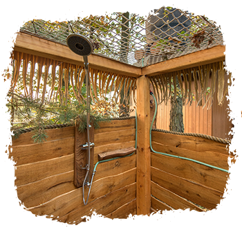 Osvěžení po dni v přírodě vám nabídne i naše originální „lesní koupelna“ s venkovní sprchou a samozřejmě venkovní WC.