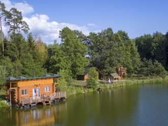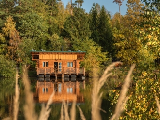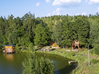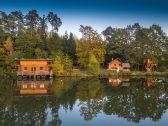 Vyhlídkový posed v korunách stromů nejen pro myslivce a plovoucí srub na vodě nejen pro rybáře
